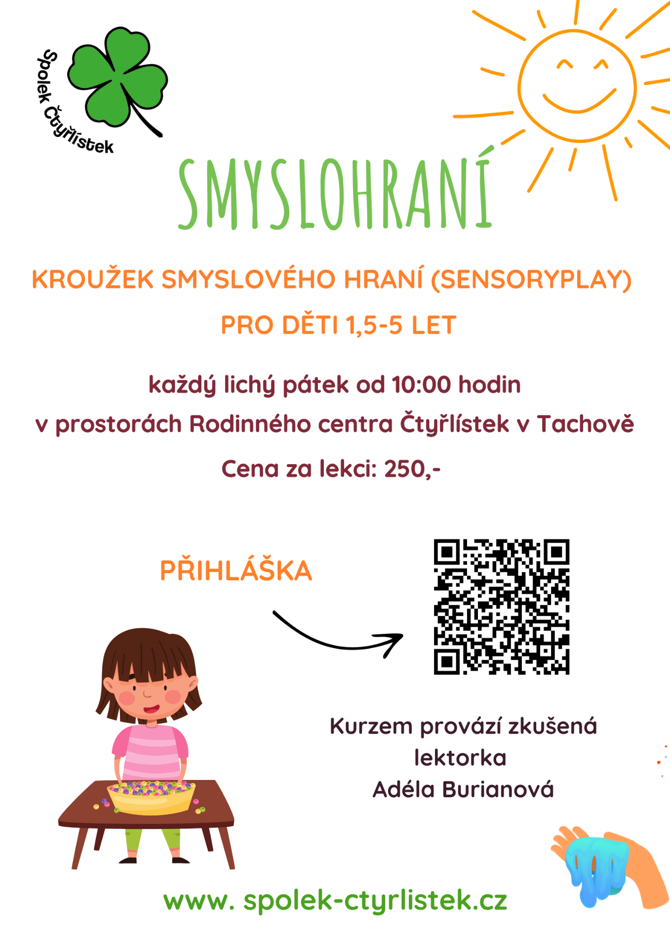 Kurz probíhá pod vedením lektorky Adély Burianové v prostorách Rodinného centra Čtyřlístek na adrese Pobřežní 2153, Tachov.